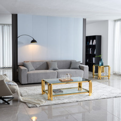 Modern Stainless Steel Coffee Table Set Set Of 2, Double-Layer Clear Tempered Glass Table Top, Coffee Table End Side Table 2-Pieces Sets For Living Room Home Office